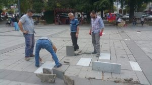 Gölcük'ün incisi olan Anıtpark'ta süs havuzunun kırılmış olan parke taşları yenileniyor. Hasar gören parke taşlarının yenilenmesi vatandaşlar tarafından olumlu karşılandı.
