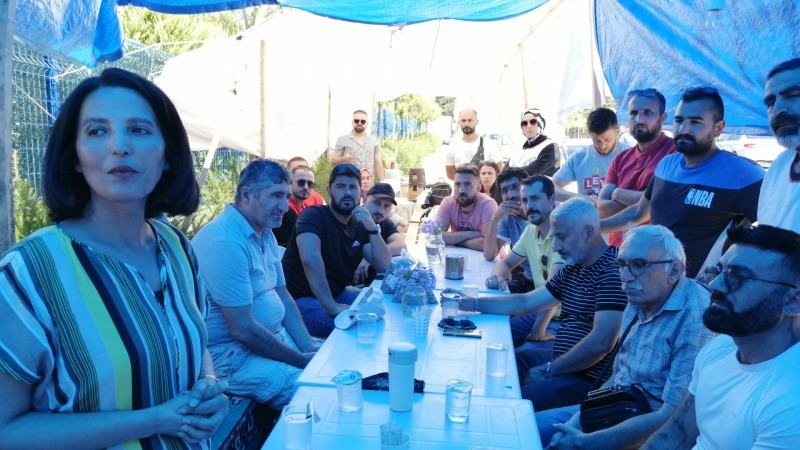 Akbelen’de günlerdir doğası için mücadele eden köylülerin durumuna da değinen Erkan, “Özelleştirmeler yetmedi orman alanlarını, tarım arazilerini imara açarak ranta peşkeş çektiler. Akbelen’de köylüler yıllardır nöbet tutuyor, günlerdir ormanına sahip çıkıyor. Bugün sizinle dayanışmaya geldik ama Akbelen’le de dayanışalım istedik. Toprağımıza, suyumuza, ağacımıza birlikte sahip çıkalım. Köylünün mücadelesiyle işçinin mücadelesini birleştirelim ve buradan Akbelen’e selam gönderelim” dedi. Ziyaretin ardından grevci işçiler ve EMEP üyeleri grev çadırında “Akbelen’e dokunma” ve “Akbelen bizimdir bizim kalacak” sloganı attı.