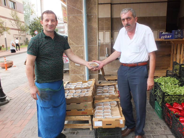 İlçemizin tanımmış esnaflarından olan Çıtır Manav'ın sahibi İrfan Uysal ve Seçkin Balık'ın sahibi Kerim Bekar, Muharrem ayının gelmesiyle birlikte bugün Merkez Mahallesi Preveze Caddesi'nde bulunan iş yerlerinin önünde 500 kişilik aşureyi kendi elleriyle Gölcük halkına dağıttı.