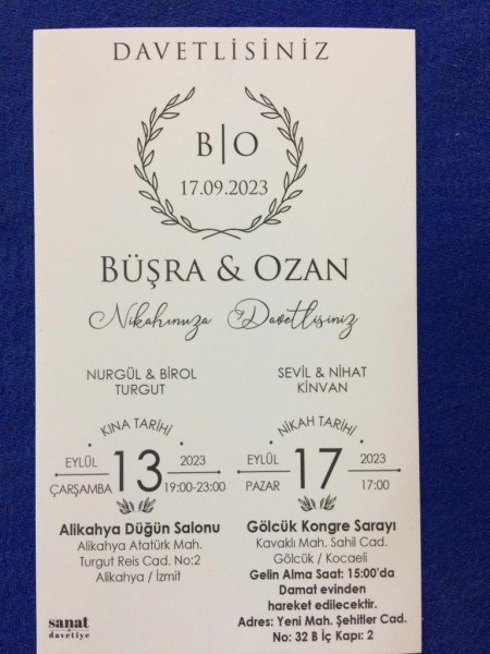 Kinvan ve Turgut Aileleri bu mutlu günlerine tüm dostlarını ve sevenlerini davet etti. Gelin Almaya 17 Eylül Pazar günü saat 15.00'de Yeni Mahalle, Şehitler Caddesi, No 32, B İç Kapı 2 adresinde yer alan Damat evinden hareket edilecek. Bizde Gölcük Haber Gazetesi Ailesi adına Büşra ve Ozan Çiftine ömür boyu mutluluklar diliyoruz.