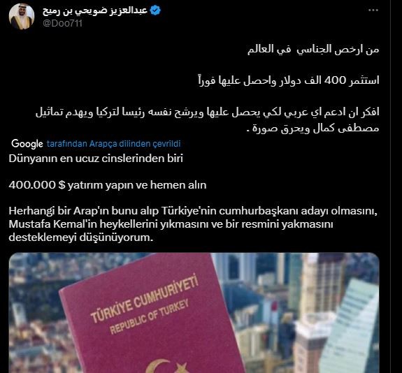 Kılıç, yazılı açıklamasında, “Şehitlerimizin kanlarıyla sulanan vatanımızdaki sığınmacı işgali ve onlardan kaynaklı bozulan sosyolojimiz, dibe vuran ekonomimiz, ortadan kaybolan güvenliğimiz yetmiyormuş gibi bir de onların hamilerinin pişkinlerini izlemekteyiz. Ne yazık ki onlar özelikle son günlerde Türkiye'nin sahibi gibi davranmakta ve hadlerini aşmaktadırlar. AK Parti iktidarı tarafından üç kuruşa verilen Türkiye Cumhuriyeti Vatandaşlığı ne yazık ki itibarımızı sarsarken, son olarak da Kuveytli bir yazar bozuntusu çıkmış ve 'Türk pasaportu dünyanın en ucuz şeylerinden biri. 400.000 dolar yatırım yapın ve hemen vatandaşlık alın. Herhangi bir Arap'ın Türk pasaportu alıp Türkiye’nin yeni Cumhurbaşkanı adayı olmasını ve Mustafa Kemal'in heykellerini yıkmasını destekliyorum' demiştir. Fakat bu alçakça ifadelere iktidar partisinden bir tepki bile gelmemiştir.'