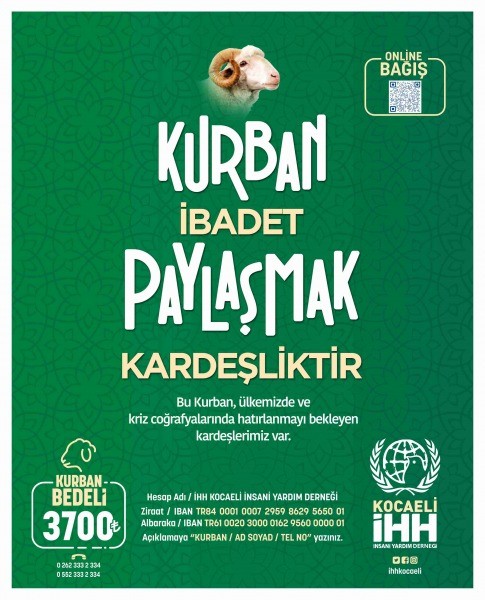 İHH Kocaeli İnsani Yardım Derneği, bu yıl da Kurban faaliyetlerini sürdürüyor. 3700 TL olarak açıklanan Kurban hisse bedeli üzerinden Kurban bağışlarını kabul eden İHH, bayram boyunca da vatandaşların bağışlamak istedikleri kurban etlerini de kabul edecek.
