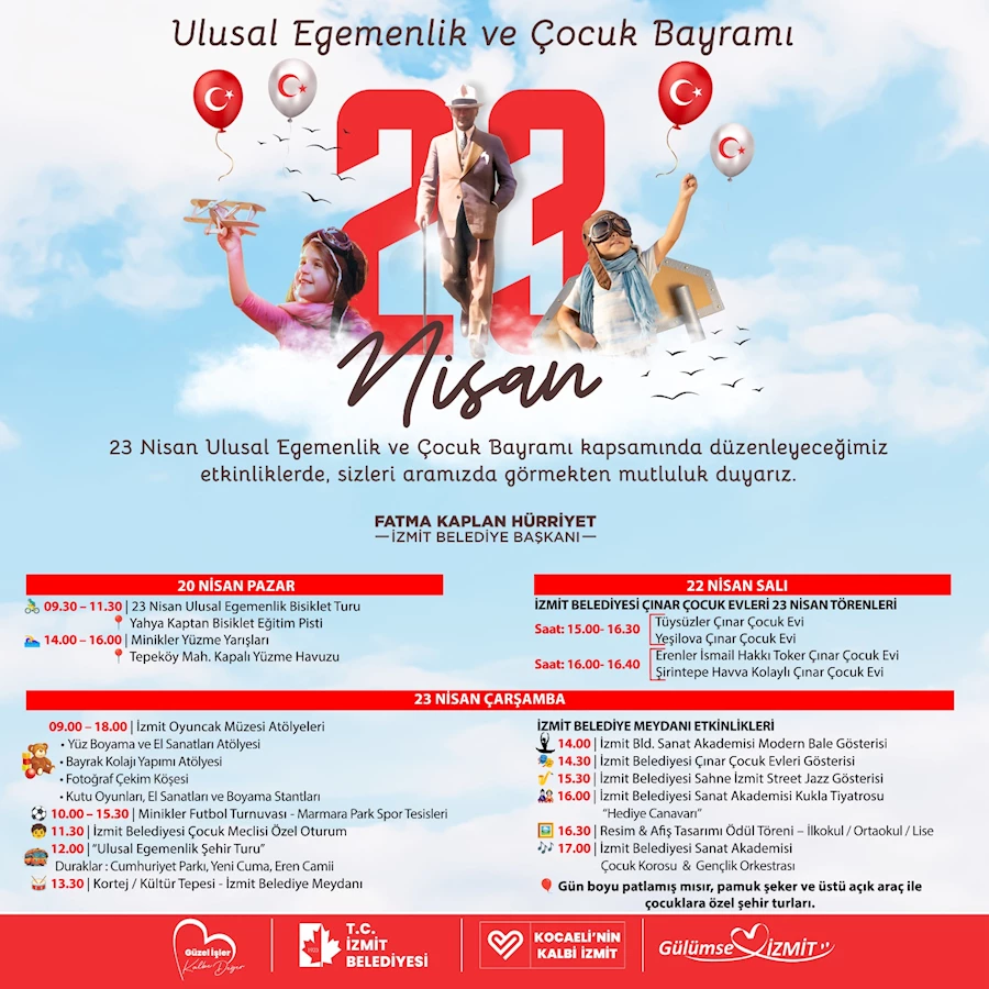 Ulu Önder Mustafa Kemal Atatürk’ün dünya çocuklarına armağan ettiği 23 Nisan Ulusal Egemenlik ve Çocuk Bayramı, İzmit’te yine büyük bir heyecan ve coşkuyla kutlanacak. İzmit Belediyesi, bu özel günün anlamına yakışır bir programla çocuklarımızın neşesine neşe katacak. Tüm kenti saracak bayram havası, birbirinden renkli etkinliklerle dolu dolu bir şölene dönüşecek.