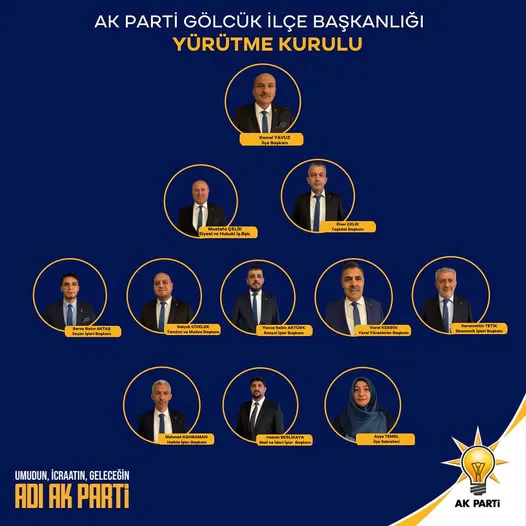 AK Parti Gölcük İlçe Başkanı Kemal Yavuz’un değişikliklerden sonra yeni yürütme kurulu ve görevleri şöyle oluştu: