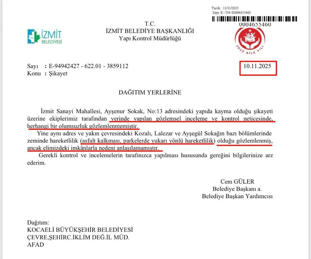 Hürriyet'in metro iddiasına İzmit'teki bir olay üzerinden belgesi ile yanıt veren Başkan Büyükakın şunları söyledi; "Oradaki binanın metrodan yıkıldığını açıklayan size, 10 Kasım 2025 tarihinde İzmit Belediyesi'nden Büyükşehir'e gelen şu yazıyı göstermek istiyorum. İzmit Sanayi Mahallesi'ndeki bir yapıda kayma olduğu şikayeti olduğu üzere herhangi bir olumsuzluk gözlemlenmediğini yazmışsınız. Belediyenizdeki imkanlar ile küçük bir kaymanın nedenini anlayamadınız da binanın metrodan kaynaklı olduğunu nasıl anladınız. Bu tespit edilemezken, metronun üzerinde yıkılan binanın tespitini hangi yetkinlikte yaptınız? Sorum bu.
