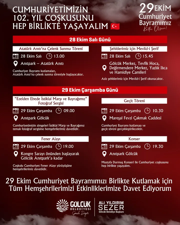 Gölcük Kaymakamlığı, Gölcük Belediyesi ve İlçe Millî Eğitim Müdürlüğü iş birliğinde düzenlenecek etkinliklerle Cumhuriyet’in 102. yılı Gölcük’te kutlanacak. Etkinlikler, 28 Ekim Salı günü saat 13.00’da Anıtpark’ta düzenlenecek çelenk sunumu töreni ile başlayacak. Törenler, 29 Ekim Çarşamba günü saat 10.00’da Anıtpark’ta düzenlenecek tebrikat ve ardından Mareşal Fevzi Çakmak Caddesi üzerinde düzenlenecek geçit töreni ile devam edecek.