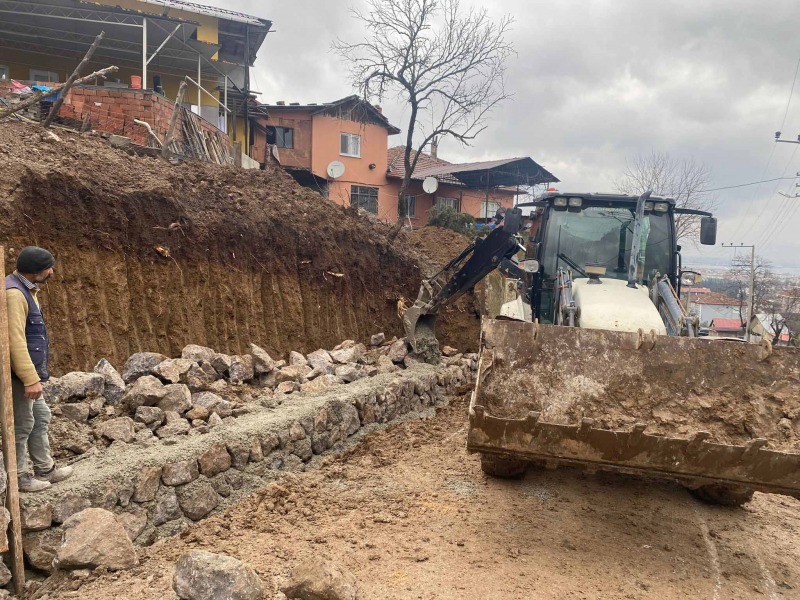 Hamidiye Okyar Caddesinde yolun virajlı olması sebebiyle trafik akışını olumsuz yönde etkileyen kısım genişletiliyor ve taş duvar imalatı yapılıyor