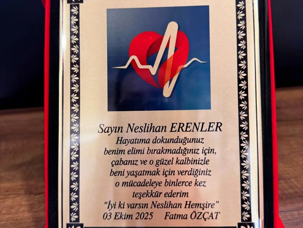Fatma Özçat, Gölcük Necati Çelik Devlet Hastanesi Başhekimi Op. Dr. Aziz Çardak ve hastane idaresinin katılımıyla gerçekleştirilen ziyarette, Hemşire Neslihan Erenler’e teşekkür ederek plaket ve çiçek takdiminde bulundu. Ayrıca olay günü müdahalede görev alan Acil Tıp Uzmanı Uzm. Dr. Hasan Demirbaş’a da teşekkürlerini iletti. Hasta, plaketin üzerine şu anlamlı cümleyi yazdırdı: “Hayatıma dokunduğunuz, elimi bırakmadığınız için; çabanız ve güzel kalbinizle beni yaşatmak adına verdiğiniz o mücadeleye binlerce kez teşekkür ederim. İyi ki varsınız Neslihan Hemşire.”