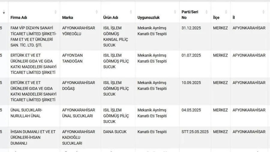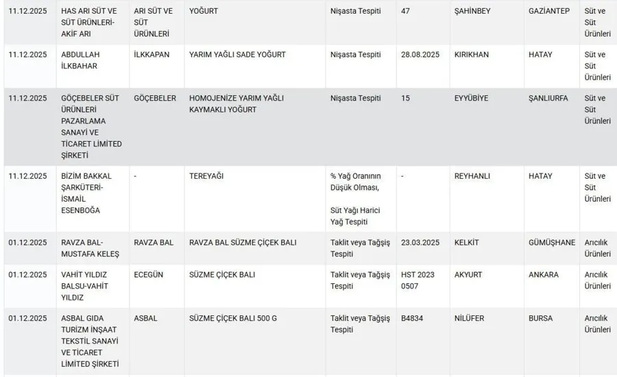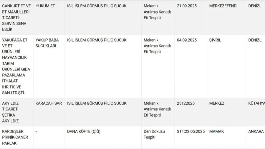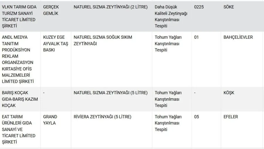 Listeye göre; dana sucukta tavuk eti, köftede deri dokusu, hamburgerde kalp, kır pidesinde sakatat, kebapta kalp ve böbrek, zeytinyağında tohum yağı, yoğurtta nişasta tespit edildi.