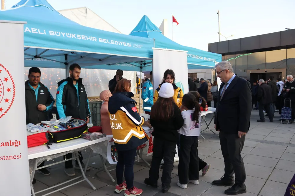 Stantta görev alan hemşireler, diyetisyenler ve sağlık profesyonelleri tarafından vücut analizi, tansiyon ve kan şekeri ölçümleri gerçekleştirildi. UMKE ve İlkyardım ekipleri de stantta yer alarak vatandaşlara acil durum müdahalesi, OED cihazı kullanımı ve ilk yardım konularında bilgilendirme yaptı.