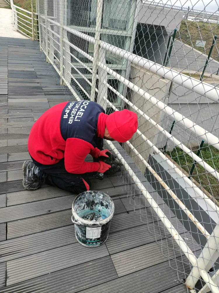 Akçaray Tramvay Durağından Şehir Hastanesi’ne yaya ulaşımını sağlayan üstgeçitte yapılan incelemelerde, çeşitli noktalarda fiziksel bozulmalar tespit edildi. Bunun üzerine harekete geçen Büyükşehir A Takımı ekipleri, güvenliği tehdit eden ve kullanım konforunu düşüren alanlarda tadilat çalışması yaptı.