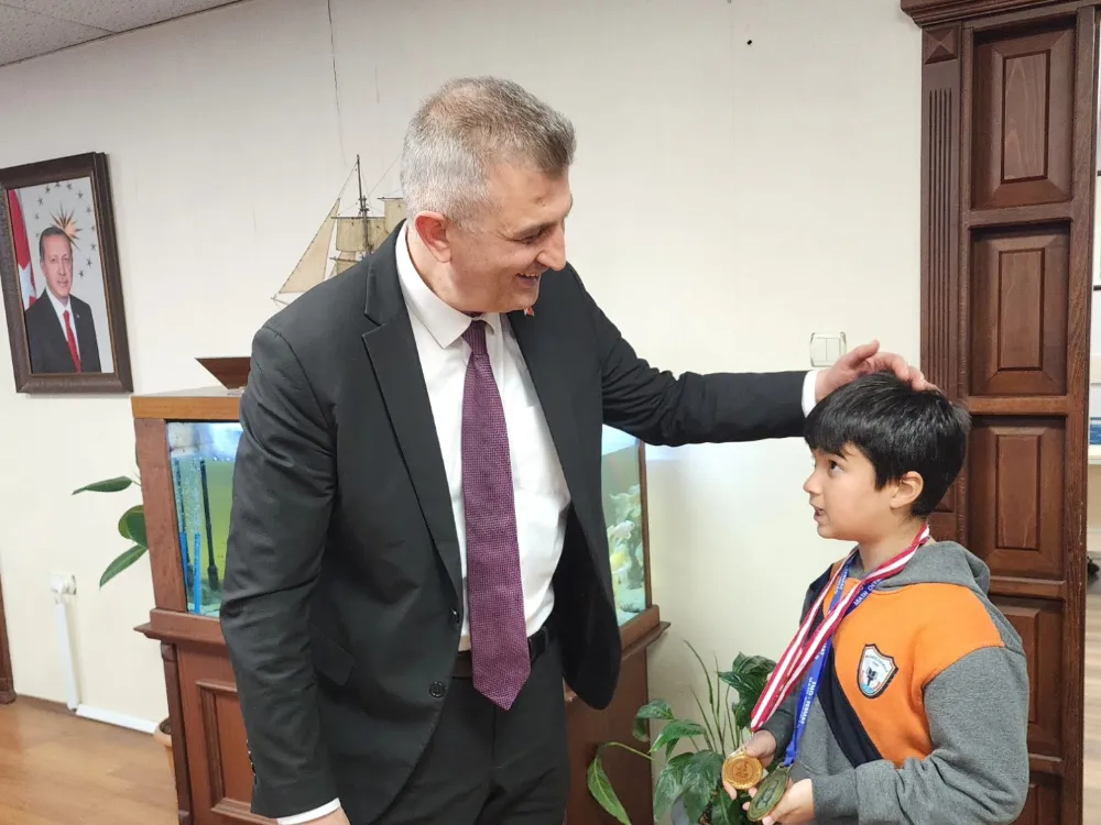 Gölcük Belediye Başkanı Ali Yıldırım Sezer, Güneydoğu Asya Matematik Olimpiyatları ve FERMAT Matematik Olimpiyatlarının Ulusal Turu'nda 3 altın madalya kazanan Halıdere İlkokulu öğrencisi Sarp Arel Güvenç’i makamında ağırlayarak tebrik etti.