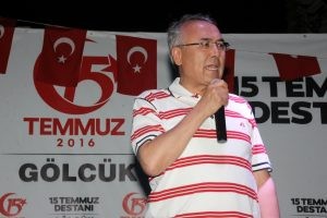 Anma etkinlikleri sonunda bir konuşma yapan Gölcük Belediye Başkanı Mehmet Ellibeş, “Saygı Değer Kaymakamım ve bütün Gölcük vatandaşları, hanımefendiler , yavrularımız her birinizi sevgiyle saygıyla kalbimle selamlıyorum. Bir vatan nöbetini daha beraber başarıyla tutmanın mutluluğu, huzuru ve onuru içerisindeyiz. Yüce Rabbim bu ülkeye, bu vatana, bu millete inşallah bir daha böyle felaketleri yaşatmaz ,bu tür kalkışmalara fırsat vermez. Milletimize yapılan bu kalkışmada halkımızın olanlara karşı dik duruşuyla gösterdiği o mücadeledeki azim ve kararlılığında hamdüsenalar olsun ki Yüce Rabbime biz beraberiz ve dimdik ayaktayız. 2 gündür nöbetimizi tutuyoruz, özellikle ben hanımefendilere teşekkür etmek istiyorum , hanımlarımız ,kadınlarımız en istikrarlı nöbeti tutan taraf olmuştur, dualarıyla duruşlarıyla burada bize güç verdiler her zaman her daim bu duruşlarını sergilediler her birinden Allah razı olsun inşallah bu birlik ve beraberliğimiz ilelebet devam edecek, bizler Sayın Cumhurbaşkanımız Recep Tayip Erdoğan’ın önderliğinde birlik ve beraberliğimizi, mücadelemizi sürdürmeye devam edeceğiz inşallah, bundan hiç kimsenin bir tereddüttü olmasın ,en ufak bir şüphesi bulunmasın biz bu duruşumuzu sürdürmeye devam edeceğiz. Ben bu organizasyonda görev alan tüm kardeşlerimi, çalışanları emek veren herkesi tebrik ediyorum ve teşekkür ediyorum. Değerli Kaymakamımıza teşekkürlerimizi şükranlarımızı arz ediyoruz birlikte burada bu duruşu sergilediler ve bize önderlik ettiler, Emniyet mensuplarına teşekkür ediyoruz, güvenlik görevlilerimiz her zaman ki fedakarlıklarını gösterdiler büyük bir özveriyle 24 saat esasıyla burada görevlerini yaptılar. Vatanını gönülden seven, Peygamber ocağımızın temsilcileri olan değerli askerlerimizi, dün bizlerle beraber olan şerefli ordumuzu, Donanmamızı ,Değerli Komutanımızı Deniz Ana Üst komutanımız ve onla birlikte tüm şerefli askerlerimize buradan teşekkürlerimizi, şükranlarımızı arz ediyoruz, onlar bu memleketin Mehmetçikleridir onlar bizim evlatlarımızdır. Ben bu duygular içerisinde bir kez daha hepinize sonsuz şükranlarımı ,teşekkürlerimi arz ediyorum, her birinize sağlıklı ,sıhhatli, mutlu, huzurlu ve barış içerisinde nice yıllar yaşatmasını dilerim Yüce Rabbimden. Tüm şehitlerimize bu vesileyle bir kez daha rahmet diliyorum, ruhları şad olsun, mekanları cennet olsun inşallah” dedi.