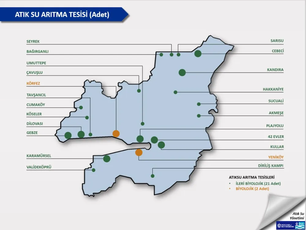 İnsan sağlığı ile çevrenin korunmasına büyük önem veren Kocaeli Büyükşehir Belediyesi İSU Genel Müdürlüğü, şehir merkezinden kırsal alanlara kadar her noktada bütün kenti kanalizasyon altyapı ağlarıyla işleyerek atık su arıtma tesisleri inşa etti. 23 adet atık su arıtma tesisi ile şehirde bir damla suyu arıtmadan doğaya bırakmayan İSU Genel Müdürlüğü, %73 oranında ileri biyolojik ve %100 biyolojik atık su arıtma gerçekleştiriyor. İleri biyolojik arıtma yapılmayan mevcut atık su arıtma tesislerinde, yatırım planı kapsamında yapılacak çalışmalar ile ileri biyolojik seviyesine çıkarılarak Türkiye’de ilk %100 ileri biyolojik arıtma yapan Büyükşehir Belediyesi olacak.