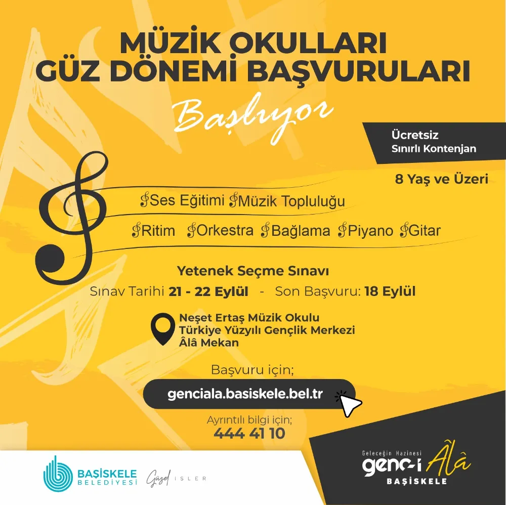 Müzik Okulları’na son başvuruların alınmasından sonra 21-22 Eylül 2024 tarihlerinde Başiskele Belediyesi Müzik Eğitmenleri tarafından yetenek seçme sınavı yapılacak. Sınavı başarıyla geçen Başiskele’nin âlâ müzisyen adayları Neşet Ertaş Müzik Okulu, Türkiye Yüzyılı Gençlik Merkezi ve Âlâ Mekân’da müzik eğitimlerine başlayacak.