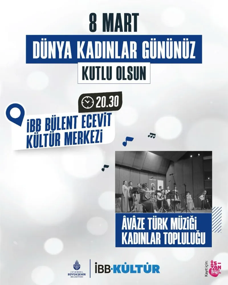 8 Mart 2025 Cumartesi günü saat 20:30’da İstanbul Bülent Ecevit Kültür Merkezi’nde A V A Z E Klasik Türk Müziği Kadınlar Topluluğu tarafından gerçekleştirilecek olan Toplulukta yer alan Sazendeler*: Nermin Kaygusuz (Kemençe), Ayşegül (kanun), Göknil (Tanbur), Buse Sever (ud), Ve Hanendeler*: Şerife Güvençoğlu, Nilgün Doğrusöz, Nesibe Özgül Turgay, Sinem Özdemir Göçeri, Gülşah Sönmez yer alıyor.