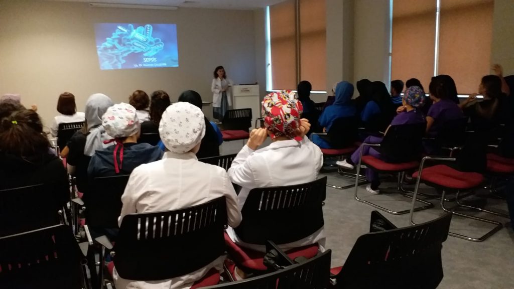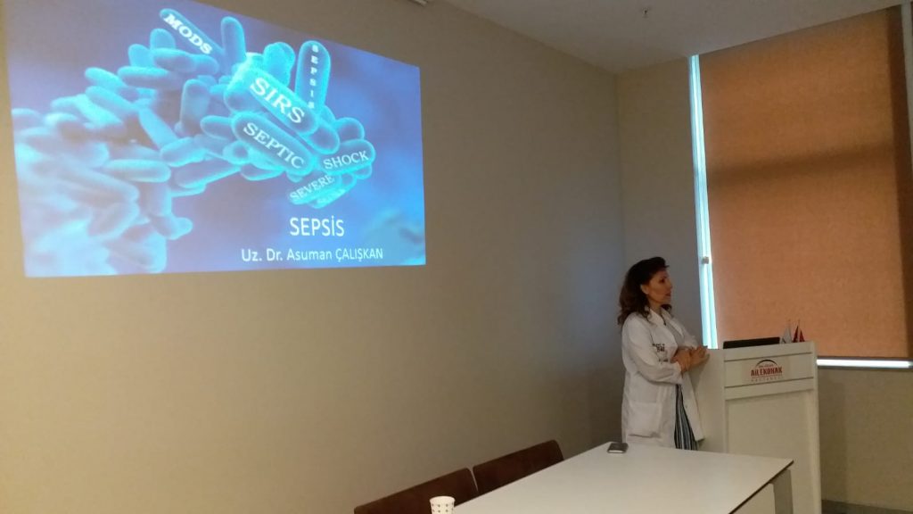 Sepsis Günü nedeniyle, hastaneye gelen hastaları bilgilendiren Aile Konak Hastanesi, Enfeksiyon Hastalıkları uzmanı Dr. Asuman ÇALIŞKAN’ın düzenlediği Sepsis bilgilendirme eğitimi ile personellerini de bilinçlendirdi. Sepsis nedir, tanısı ve belirtileri konusunda bilgiler paylaşan Dr. Çalışkan, konuşma bozukluğu, şuur bulanıklığı, titreme, yüksek ateş, kas ağrısı, nefes darlığı, ciltte renk değişikliği gibi belirtiler veren Sepsis’e karşı duyarlı olunması gerektiğini vurguladı.