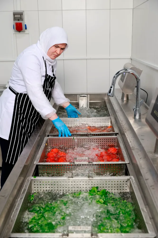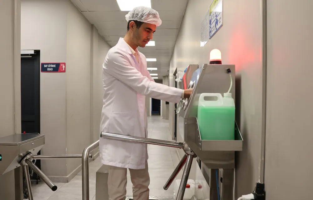 Üretim alanına giriş yapan personel; ayak tabanı dezenfeksiyonu, otomatik el dezenfektanı, turnike kontrollü geçiş ve koruyucu ekipman zorunluluğu gibi sıkı prosedürlerden geçiyor. Sebzeler ozonlu suyla yıkama makinelerinde işlenerek bakteri, virüs ve tarım ilacı kalıntılarından arındırılıyor. Kimyasal temizlik maddeleri yalnızca bakanlık onaylı ürünlerden seçilirken, tüm ekipmanlar renk kodu sistemiyle ayrılarak çapraz bulaşma tamamen engelleniyor. Bu uygulamalar, Hızır 41’in gıda güvenliğini en üst düzeyde sağlamasını mümkün kılıyor.