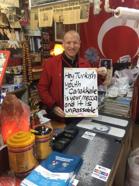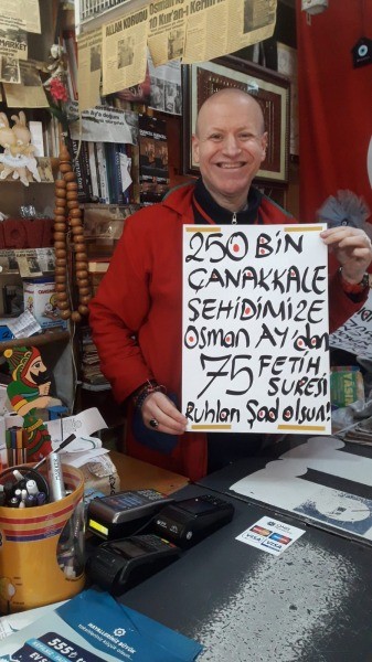 Çanakkale Şehitlerimiz ve tüm şehitlerimiz için Fetih Suresi okuduğunu belirten Osman Ay, ‘Çanakkale Zaferi Kanla yazılmış bir destandır. Çanakkale Şehitlerimiz adına marketime gelen müşterilerime lokum dağıttım. Seccade ve Kur’an-ı Kerim hediye ettim. Milletin geleceği için kendi geleceğinden vazgeçmiş kendi kaderine boyun eğmiş ama vatanını kaderine boyun eğmemiş Mehmetçiğin sessiz çığlığıdır.