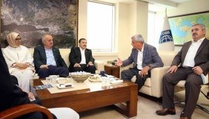 Orman ve Su İşleri Bakanı Prof. Dr Veysel Eroğlu, Valiliğin ardından Büyükşehir Belediyesini ziyaret etti. Burada Türk Dünyası Belediyeler Birliği ve Kocaeli Büyükşehir Belediye Başkanı İbrahim Karaosmanoğlu, Büyükşehir Belediyesi Genel Sekreteri İlhan Bayram karşılarken, Kocaeli Milletvekilleri Zeki Aygün ve Radiye Sezer Katırcıoğlu’da ziyarette hazır bulundu. Başkan Karaosmanoğlu birliktelikte, Bakanımız Veysel Eroğlu hocamızdan çok şey öğrendik diyerek şunları kaydetti: “İstanbul’da ki İSKİ görevi dahil olmak üzere Bakanımızın tecrübesinden her daim istifade ettik. Büyükşehir Belediyesi’nde göreve geldiğimiz ilk günden itibaren önceliklerimizi belirledik. 2007 yılının sonunda kent planlarımızı meclisten geçirdik. Altyapı ve üstyapı çalışmalarını yaptık. Susuz ve yolsuz köyümüz kalmadı. Şehirde ne varsa kentte o olacak dedik ve bunu başardık. Köylerden şehre göçü şok şükür tersine çevirdik. Kocaeli’nin her noktası eşit bir şekilde kalkındırdık. Özellikle eğitime, gençliğe ve kadınımıza dönük hizmetleri çok önemsiyoruz. Bakanlıklarımızla koordineli bir şekilde çalışıyoruz.”