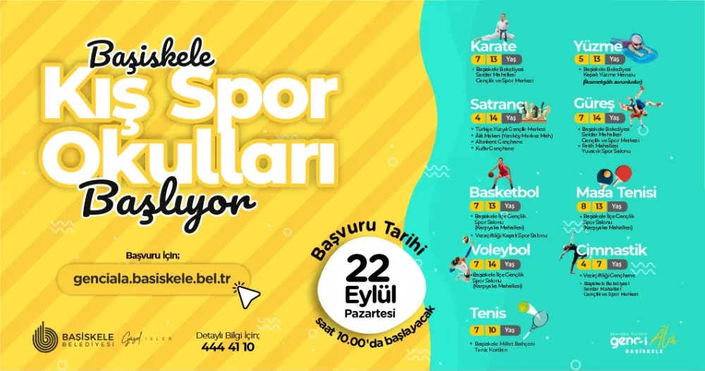 Başiskele Belediyesi’nin Genc-i Âlâ internet sayfası https://genciala.basiskele.bel.tr/ üzerinden kış spor okullarına 4-14 yaş aralığındaki çocuklar başvuru yapabiliyor. Başiskele Ücretsiz Spor Okulları Başvuru Formunu eksiksiz ve doğru olarak dolduran Başiskele’nin şanslı çocukları, kayıtlarının kabulünün ardından uzman eğitmenler tarafından verilen spor aktivitelerine başlayarak kış aylarını da verimli ve eğlenceli geçirecek.Spor okullarıyla ilgili ayrıntılı bilgiye vatandaşlar, 444 41 10 numaralı telefonu arayarak ulaşabilecek.