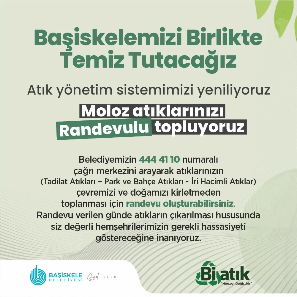 Başiskele Belediyesi tarafından daha önce "Evinizi Yenilerken Evimizi Kirletmeyelim" sloganıyla başlattığı moloz atık toplama kampanyası, çevreye duyarlı vatandaşların da desteğiyle atıklar çevreye zarar vermeden toplanmaya başlanmıştı. Moloz atık toplama işlemlerinin daha hızlı, düzenli ve etkin olması adına Başiskele Belediyesi, atık yönetim sistemini de yenileyerek moloz atıkları (tadilat atıkları –bağ bahçe atıkları - iri hacimli mobilya atıklar) için telefonla oluşturulacak randevuyla toplayacak.