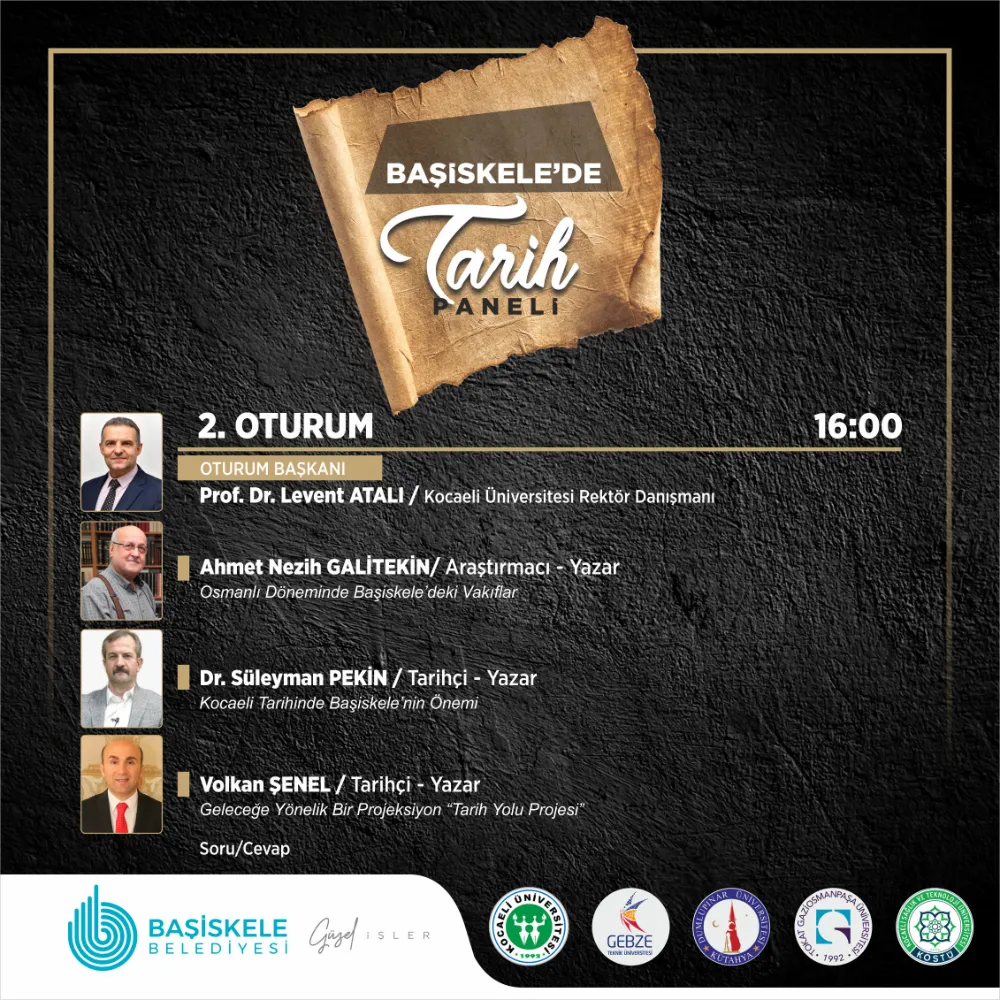 Kocaeli Üniversitesi Rektör Danışmanı Prof. Dr. Levent Atalı’nın oturum başkanlığı yapacağı panelin ikinci oturumu ise saat 16.00’da başlayacak. Kocaeli Tarihinde Başiskele’nin Önemi konusunda önemli bilgilerin aktarılacağı ikinci oturumda Tarihçi–Yazar Dr. Süleyman Pekin, tarihin izinden giderek katılımcıları geçmişe sürükleyecek. Araştırmacı-Yazar Ahmet Nezih Galitekin de Osmanlı Döneminde Başiskele’deki Vakıflar hakkında bilgiler verecek. Tarihçi-Yazar Volkan Şenel ise, Geleceğe Yönelik Projeksiyon: Tarih Yolu Projesi’ni detaylı bir şekilde anlatacak.