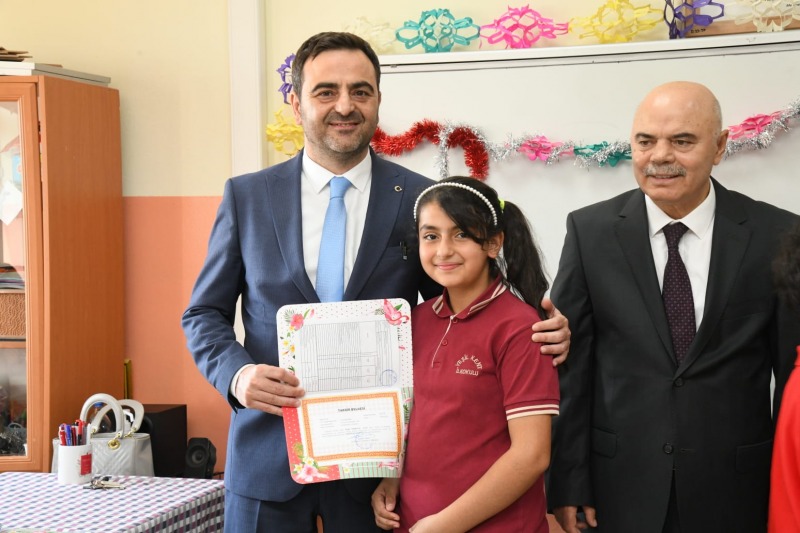 Sınıfları tek tek gezen heyet özellikle ilk kez karne sevinci yaşayan 1. sınıf öğrencilerin neşelerine ortak oldu. Öğrenciler tarafından yoğun bir sevgi seliyle karşılanan Başkan M. Yasin Özlü, minik öğrencilerin karnelerini kendi elleriyle teslim etti.