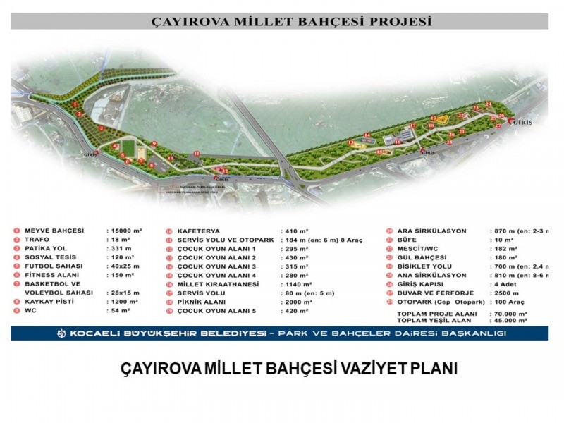 Park ve Bahçeler Dairesi Başkanlığı’nın gözetiminde devam eden Çayırova Millet Bahçesi projesi tamamlandığında Çayırova sakinlerinin buluşma noktası olacak. Millet Bahçesi’nin içerisinde bin 140 metrekare millet kıraathanesi, 410 metrekare kafeterya, 182 metrekare mescit, 120 metrekare spor tesisi, 54 metrekare tuvalet ve 10 metrekare büfe gibi yapılar yer alıyor. Projede ayrıca 125 metrekare giriş meydanı, 2 bin metre yürüyüş yolu, 700 metre bisiklet yolu, bin 740 metrekare çocuk oyun alanları, bin 200 metrekare kaykay pisti, 250 metrekare gül bahçesi, 15 bin metrekare meyve bahçesi, 2 bin metrekare piknik alanı, 45 bin metrekare yeşil alan, fitness alanı, futbol ve basketbol sahaları inşa ediliyor.