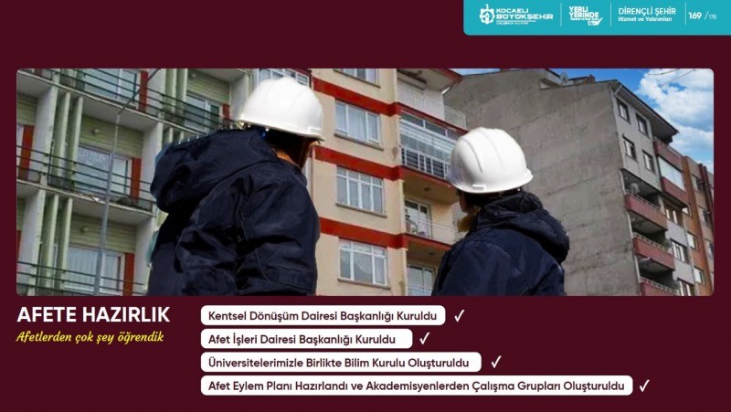Kentsel Dönüşüm Dairesi ile Afet İşleri Dairesi Başkanlığı’nı kuran, akademik çevrelerle oluşturulan Deprem Kurulu ile Afet Eylem Planı hazırlayan ve buna bağlı olarak 14 maddelik Afet Eylem Planını hayata geçirmek için akademisyenlerle ve alanında uzman isimlerle çalışma grupları oluşturan Büyükşehir, deprem gerçeğini gündeminin ilk sırasında tutuyor. Son olarak Kocaeli Büyükşehir Belediyesi ve İMO Kocaeli Şubesi ile arasında yapılan protokole göre, 1999 Gölcük depremini geçiren ve Sismik Tehlike Bölgeleri Haritasında 1. Derece Tehlikeli alanda kalan 250 bin yapı detaylı olarak taranacak. Proje kapsamında ilk 6 aylık dilimde 160 bini aşkın yapı stokunun taraması tamamlanacak. Yapılacak ikinci bir protokolle de sonraki 3 ay içinde 90 bin yapının daha incelenmesi hedefleniyor. İncelenecek yapı stoku sayısı 250 bin olacak.