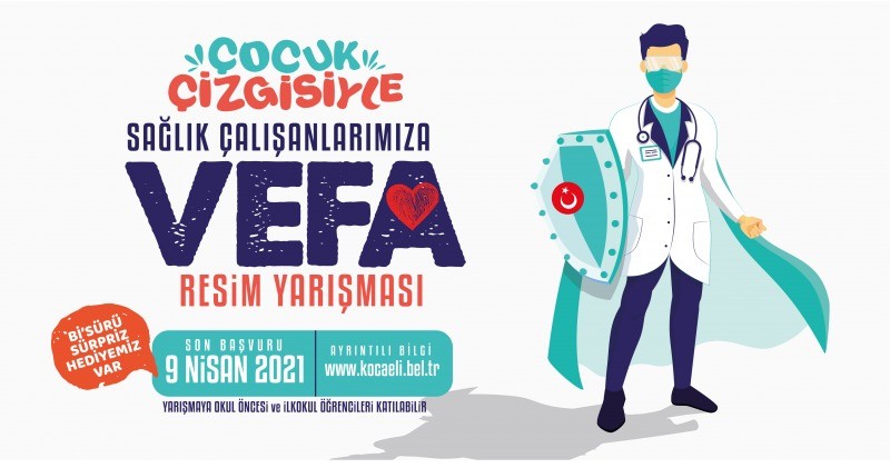 Pandemiyle mücadelede en ön saflarda görev yapan sağlık çalışanlarının her zaman yanında olan Kocaeli Büyükşehir Belediyesi özverili çalışmalarından dolayı sağlık çalışanlarına minnettarlığımızı ifade etmek ve bu zorlu süreçte bir nebze olsun motivasyonlarını arttıracağı düşüncesiyle “Sağlık Çalışanlarına Vefa” adlı resim yarışması düzenliyor. Vefa için okul öncesi ve İlkokul öğrencilerine yönelik resim yarışması düzenliyor. Sağlık Ve Sosyal İşler Dairesi Başkanlığı Kadın ve Aile Hizmetleri Şube Müdürlüğünce düzenlenen “Sağlık Çalışanlarına Vefa Resim Yarışması” son başvuru tarihi 9 Nisan 2021.