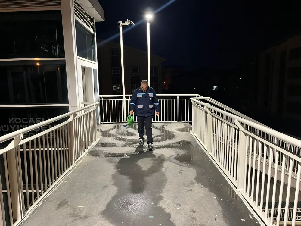Kocaeli Büyükşehir Belediyesi ekipleri, olası kazaların önüne geçmek amacıyla hastane girişleri, yürüyen merdivenler ve üst geçitlerde solüsyon uygulaması gerçekleştirirken, yaya güvenliğinin sağlanması için yoğun kullanılan kaldırımlar ve durak önlerinde tuzlama çalışmaları da yapıyor. Riskli noktalar titizlikle kontrol edilirken, buzlanmanın etkili olduğu bölgelerde müdahaleler anında gerçekleştiriliyor.