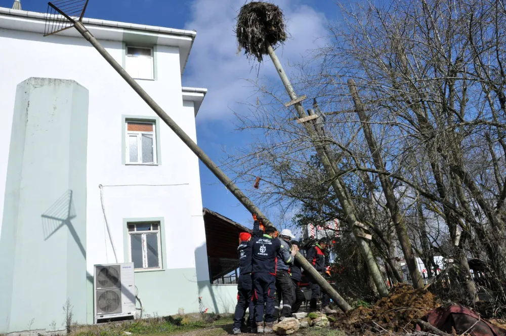Kandıra Kocakaymaz Mahalle sakinlerinden Harun Ergin, Hacıgaziler Camii’nin önünde bulunan ve leyleklerin yuva yaptığı kullanılmayan telefon direğinin yan yattığını gördü. Durumu “153 Çağrı Merkezi” üzerinden Büyükşehir’e bildiren Ergin, leylek yuvasının onarılmasını talep etti. Büyükşehir Belediyesi Yol ve Bakım Dairesi’ne bağlı A Takımı ekipleri, kısa süre içinde olay yerine giderek, leylek yuvasının bulunduğu telefon direğinin bakımını yaptı.