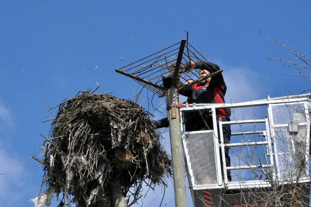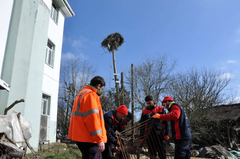 Rüzgârın etkisiyle yan yatan direk, yerinden sökülüp sağlam bir şekilde yeniden monte edildi. Ayrıca direğin üzerine kurulu olan leylek yuvası da dikkatle yerinden alındı. Eski yuvadaki dal parçaları temizlenerek, yeni yuva özenle yerine yerleştirildi. Onarım ve temizlik çalışmalarının ardından leylek yuvası yeniden kullanıma sunuldu. Yuvasına konan leylekler, yaşam alanlarına yerleşti.
