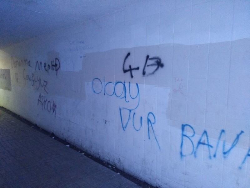 Gölcük Donanma Mevkiinde bulunan altgeçit duvarları da ne yazık ki sorumsuzlar tarafından yazılan yazılarla kirletildi. Geçtiğimiz aylarda duvar yine kirletilmiş belediye ekipleri altgeçit duvarlarını boyayarak temizlenmişti.