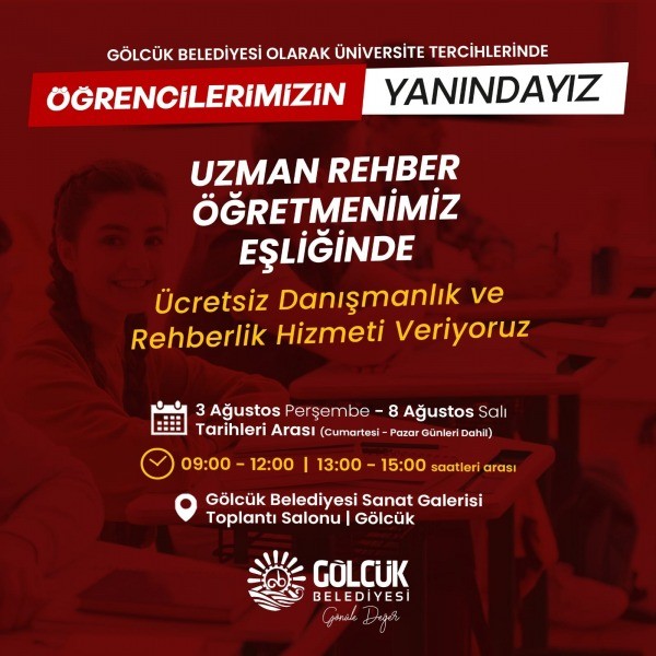 Sezer, son olarak, ‘3 Ağustos Perşembe ve 8 Ağustos Salı tarihleri arasında (cumartesi ve pazar günleri dahil ) saat:09.00–12.00, 13.00–15.00 saatlerinde, Gölcük Belediyesi Sanat Galerisi toplantı salonunda hizmet verecektir. Öğrencilerimiz için yapacakları tercihlerin hayırlı olmasını diliyorum’ dedi.