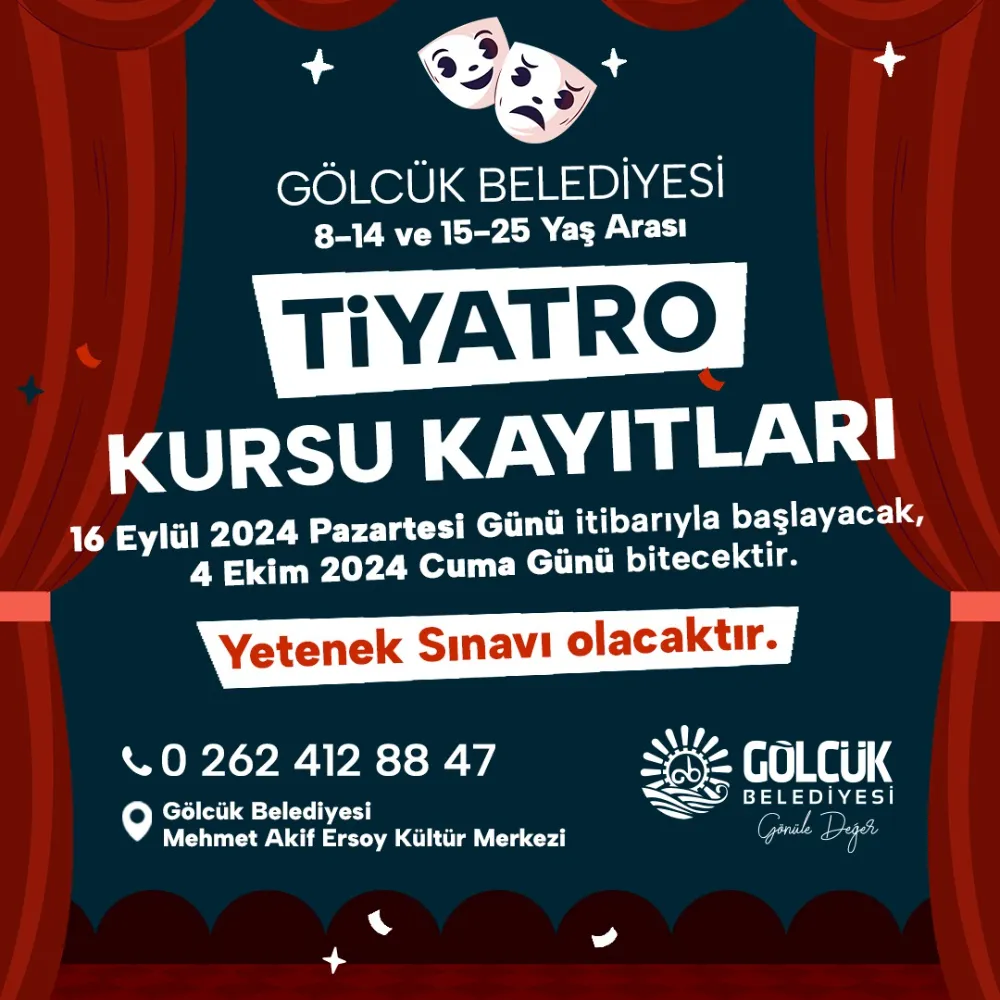 Gölcük Belediyesi, kültür-sanat sevgisini gelecek kuşaklara aşılamak için başlattığı Tiyatro Kursu eğitimleri devam ediyor. Kültür-Sanat Kenti Gölcük sloganıyla yeni yetenekler yetiştirecek olan Gölcük Belediyesi Tiyatro Kursu, yeni dönem için kayıtlarına başladı. 4 Ekim 2024 Cuma gününe kadar devam edecek kayıt işlemlerine, kursa başvuran adaylar için yetenek sınavı düzenlenecek.