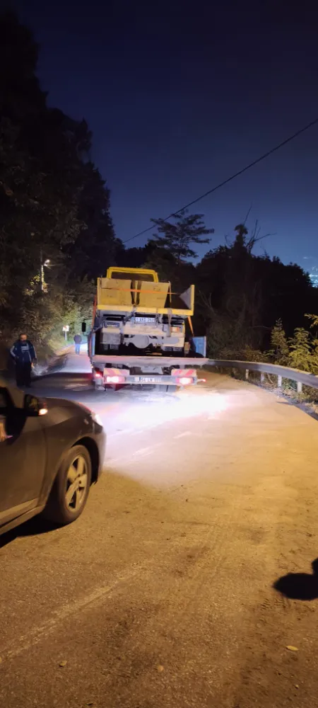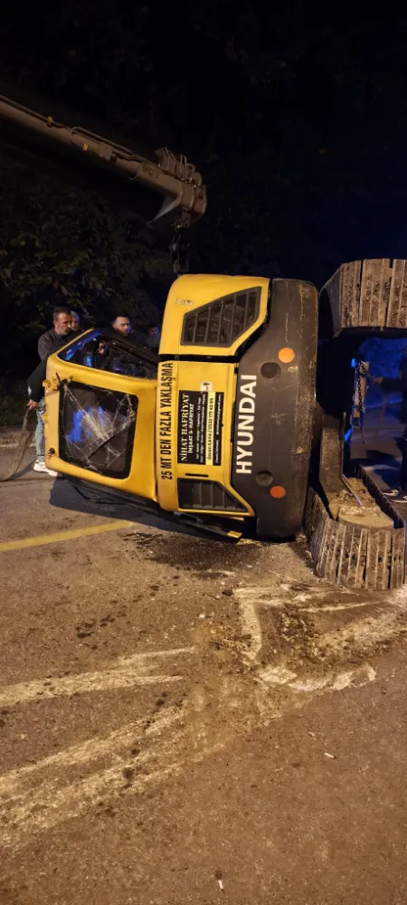 Vinç yardımıyla kamyon ve üzerindeki kepçe kurtarılarak yol trafiğe yeniden açıldı