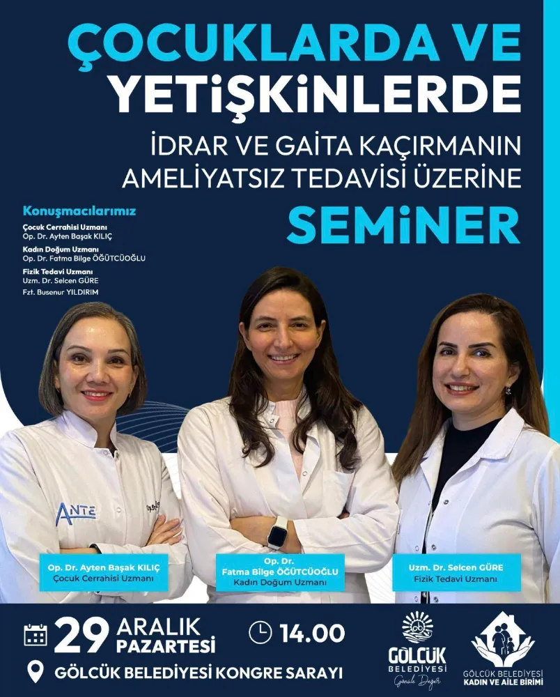 Gölcük Belediyesi Kadın ve Aile Birimi koordinasyonunda düzenlenecek seminer, 29 Aralık Pazartesi günü saat 14.00’te Gölcük Belediyesi Kongre Sarayı’nda gerçekleştirilecek. Seminerin panelist koltuğunda tıp dünyasından önemli isimler bir araya gelecek. Çocuk Cerrahisi Uzmanı Op. Dr. Ayten Başak Kılıç, Kadın Doğum Uzmanı Op. Dr. Fatma Bilge Öğütcüoğlu, Fizik Tedavi Uzmanı Uzm. Dr. Selcen Güre ve Fizyoterapist Busenur Yıldırım, idrar ve gaita kaçırma sorunlarına yönelik önemli bilgiler paylaşacaklar.