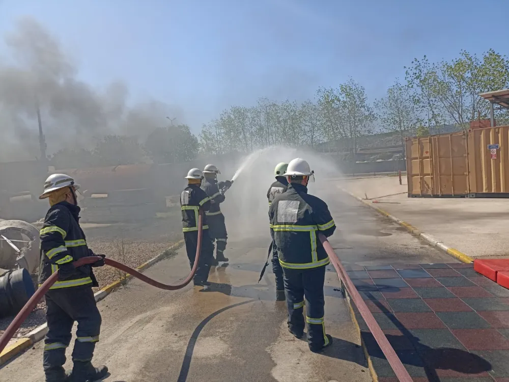 Büyükşehir İtfaiyesi Önleme ve Eğitim Şube Müdürlüğü Eğitim Birimi (KOBİTEM) personelince verilen eğitimde, simülatörler vasıtasıyla olası bir akaryakıt yangınına yaklaşma ve köpükle söndürme uygulamaları gerçekleştirildi.
