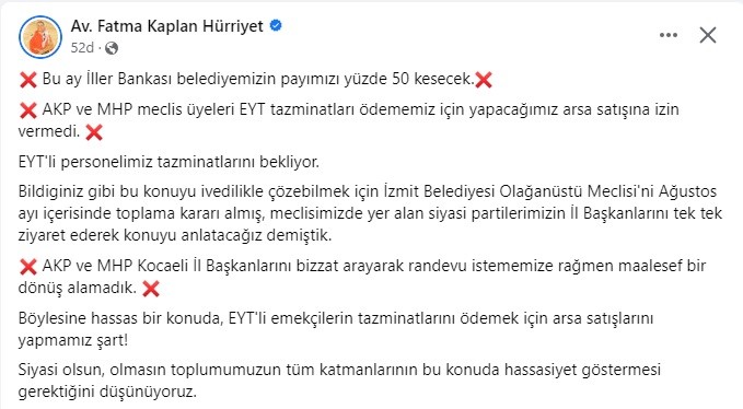 İzmit Belediyesi, EYT’li işçilerin tazminatlarını ödeyebilmek adına arazi satışı için çabalarına devam ediyor. Emekçilerin tazminatlarını alabilmesi amacıyla yapıcı muhalefet yapılması gerektiğini savunan Başkan Hürriyet bir kez daha çağrıda bulunduğu paylaşımında şu ifadelere yer verdi: Bu ay İller Bankası belediyemizin payımızı yüzde 50 kesecek. AKP ve MHP meclis üyeleri EYT tazminatları ödememiz için yapacağımız arsa satışına izin vermedi. EYT’li personelimiz tazminatlarını bekliyor.