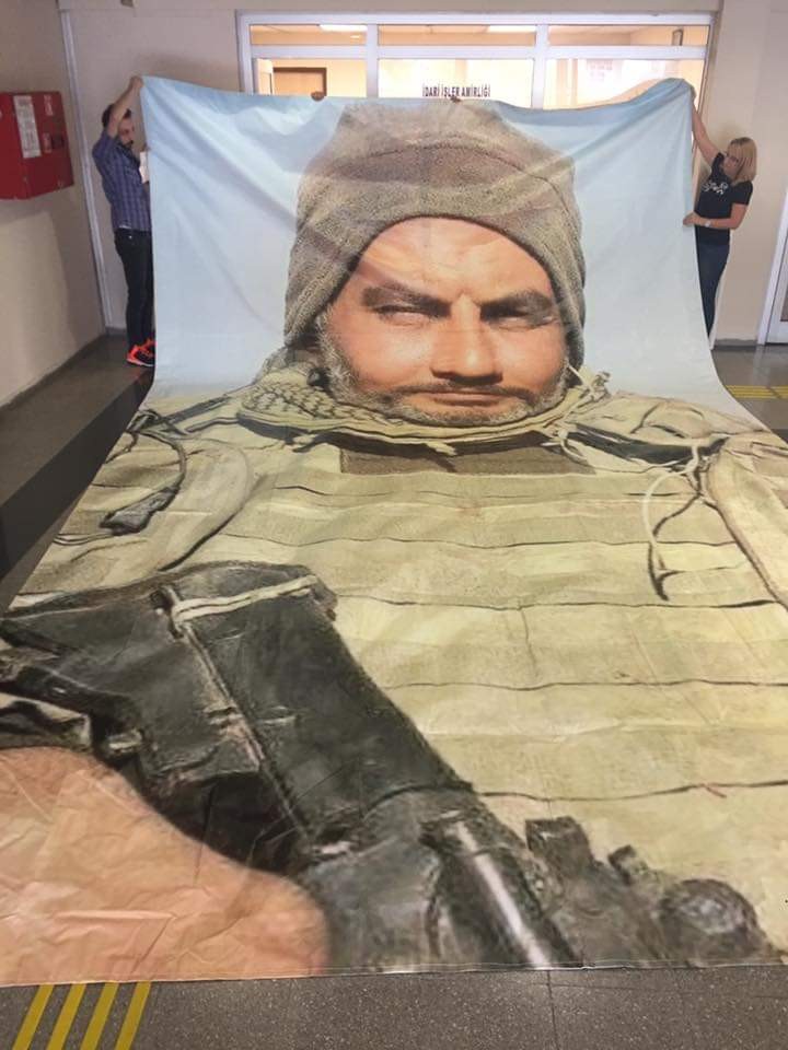 Fırat Kalkanı Operasyonu sırasında şehit düşen Binbaşı Bülent Albayrak’ın operasyon sırasında çekilen fotoğrafından oluşan ve Gölcük Belediyesi tarafından yaptırılıp gönderilen afiş tam olarak şehit düştüğü noktaya askerlerimiz tarafından asıldı.