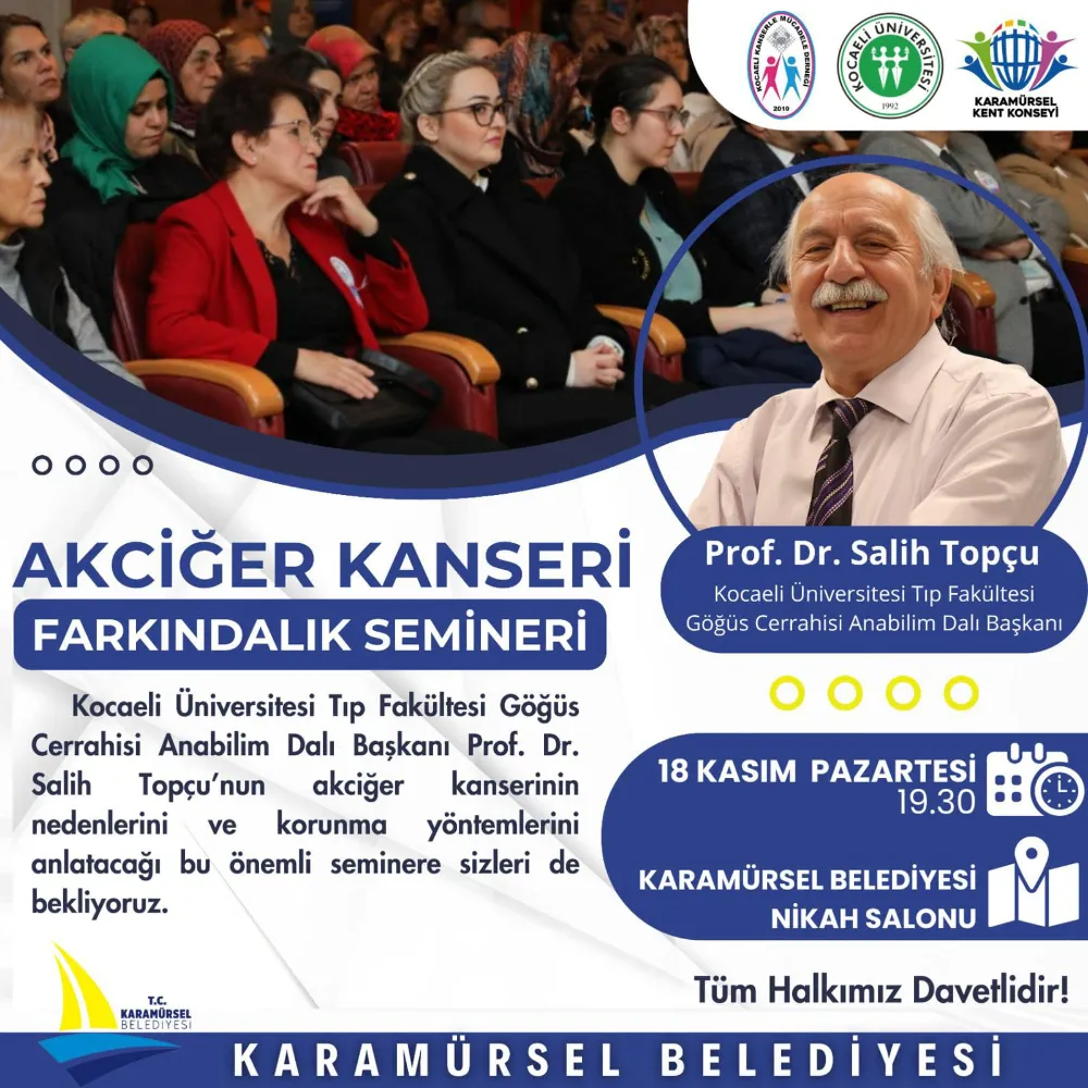 Akciğer kanseri farkındalığını artırmak ve erken teşhisin hayati önemini vurgulamak amacıyla düzenlenen seminere, ünlü kanser tedavi uzmanı Kocaeli Tıp Fakültesi Göğüs Cerrahisi Anabilim Dalı Başkanı Prof. Dr. Salih Topçu katılacak. Etkinlik, katılımcılara akciğer sağlığı hakkında değerli bilgiler sunmanın yanı sıra, bu hastalıkla mücadelede toplumsal bilinç oluşturmayı hedefliyor.