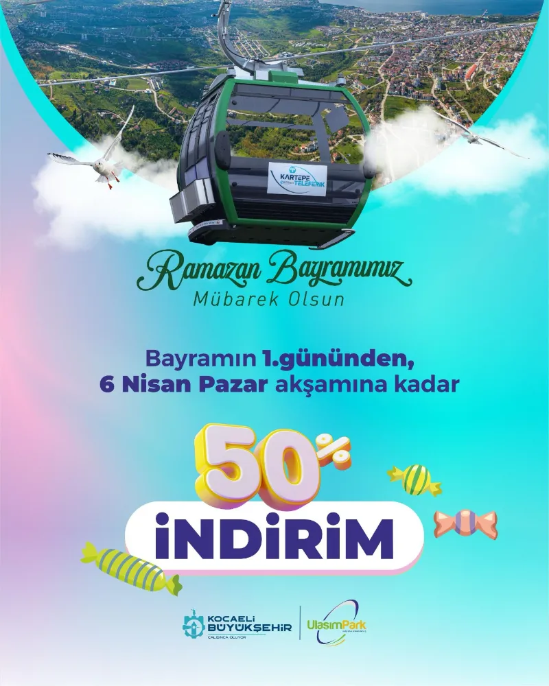Büyükşehir, Ramazan Bayramı’nda vatandaşlara Kartepe Teleferiğinde de çok özel bir indirim imkanı sunuyor. Büyükşehir’in vizyon projesi olan Kartepe Teleferiği, bayramın 1. gününden (30 Mart Pazar), 6 Nisan Pazar akşamına kadar yüzde 50 indirimli hizmet verecek. Sapanca Gölü ve şehir manzarası eşliğinde Kuzuyayla’ya çıkarak eşsiz doğanın tadını çıkarmak isteyenler 8 gün boyunca teleferikten yüzde 50 indirimli yararlanabilecek.