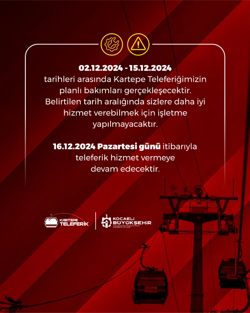 Kocaeli Büyükşehir Belediyesi iştiraki UlaşımPark tarafından işletilen Kartepe teleferik hattı bakıma alınıyor. Kuzuyayla’ya güvenli ve konforlu ulaşımın sürmesi amacıyla gerçekleştirilecek olan bakım süresince teleferik hattı kapalı olacak. Derbent ile Kuzuyayla arasında faaliyet gösteren teleferiğin ziyaretçilerine sorunsuz ve kaliteli hizmet vermeye devam edebilmesi için 02-15 Aralık tarihleri arasında kapsamlı planlı bakım çalışması yapılacak. 14 gün sürecek planlanan bakım çalışmalarının tamamlanmasının ardından teleferik, 16 Aralık pazartesi günü itibariyle hizmet vermeye devam edecek.