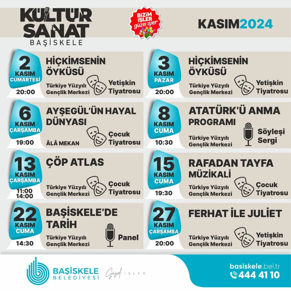 Başiskele Belediyesi Kültür ve Sosyal İşler Müdürlüğü koordinesinde Kocaeli Büyükşehir Belediyesi iş birliğiyle hazırlanan etkinlikler kapsamında yetişkinlere ve çocuklara özel birçok tiyatro, söyleşi, panel ve sergi sanatseverlerle buluşacak. Başiskele Belediye Başkanı M. Yasin Özlü’nün talimatıyla kentte kültür ve sanat faaliyetleri Kasım ayında hız kesmeden devam ediyor.