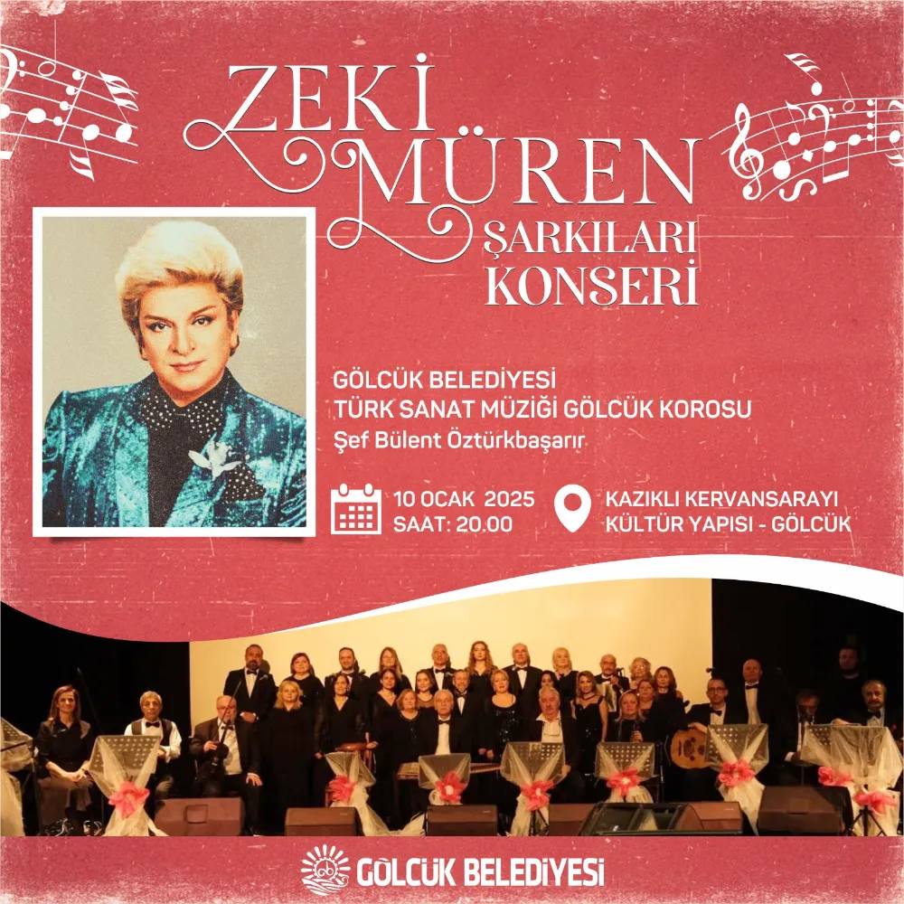 Gölcük Belediyesi Konservatuvarı Türk Sanat Müziği Gölcük Korosu, 10 Ocak 2025 Cuma akşamı Saat 20.00’da Kazıklı Kervansaray Kültür Yapısında Türk sanat müziği tutkunları Zeki Müren Şarkıları konseri ile buluşacak. Şef Bülent Öztürk yönetimindeki TSM Gölcük korosu Zeki Müren Şarkıları konserinde sanat müziği tutkunlarına unutulmaz bir akşam yaşatacak. Gölcük Belediye Başkanı Ali Yıldırım Sezer, Türk sanat müziğinin birbirinden güzel eserlerinin icra edileceği konsere tüm hemşehrilerini davet etti.