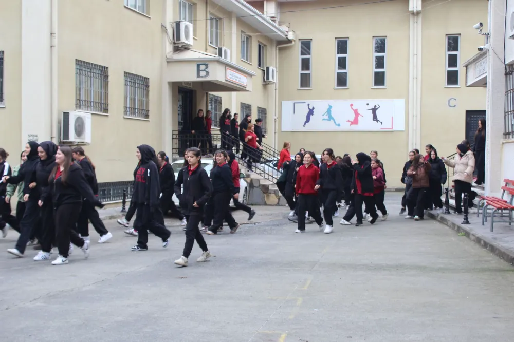 Anadolu Kalkınma Vakfı Kız Mesleki ve Teknik Anadolu Lisesinde gerçekleştirilen tatbikatta öğretmen ve öğrenciler okulun toplanma alanı kabul edilen bahçesine 1 dakika 53 saniye içinde toplanarak binayı tahliye etti.