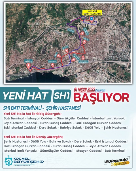 İzmit Çarşı Merkezi –Kadıköy Mah.- Mehmet Ali Paşa – Bekirdere Mah.- 28 Haziran ve şehir hastanesi. Vatandaşların Şehir Hastanesine erişim sağlaması için 9-12 mt. Araçlar ile hizmet verilecek. Ayrıca Darıca, Çayırova, Gebze, Dilovası, Körfez, Derince, Kartepe, Başiskele, Gölcük, Karamürsel ilçelerimizden gelen hatlardaki yolcularımız, Orduevi, Seka Park Batı Terminali bölgesinden aktarmalı olarak Şehir hastanesine bu hat ile ulaşabilecek. Darıca, Çayırova, Gebze, Dilovası, Körfez, Derince, Kartepe, Başiskele, Gölcük İlçelerinden gelen Belediye/Ulaşımpark hatlarındaki ana tarifeleri kullanan yolcular bu hat ile ücretsiz veya tamamlayıcı aktarma ile Şehir hastanesine ulaşabilecek.
