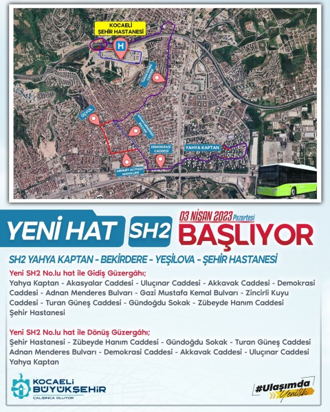 İzmit Yahya Kaptan Mah.-Yenişehir Mah.- Mehmet Ali Paşa Mah.- Bekirdere Mah.-Tavşantepe Mah. – Yeşilova Mahallesi – Şehir Hastanesi. SH2 hattı ile Yeşilova, Tavşantepe, Şirinevler, Bekirdere bölgelerinin Yahya Kaptan Mahallesi ile entegrasyonu sağlanarak, Yahya Kaptan Mahallesindeki okullarda eğitim öğretim görmekte olan öğrencilerin tek vasıta ile toplu taşıma hizmeti sağlanmış olacak.